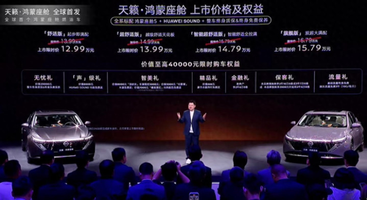 广州车展舞台,东风日产正式上市了天籁·鸿蒙座舱版,这款新车的售价为13.99-16.79万,但厂家还给了一个上市限时价,12.99-15.79万,怎么样,这个价格够有诚意了吧。
