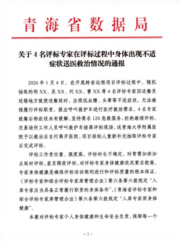 近日,青海省数据局在青海省公共资源交易网发布通报称,1月4日,参与项目评标的4位专家因送餐延时导致低血糖、头晕等不适症状,无法继续履行评标职责。本着对评标专家个人身体健康和生命安全负责、保障每一个招标项目评标活动顺利进行、避免评标期间发生人身意外,不再将4名专家聘任为省综合评标专家库评标专家,并调整出库。