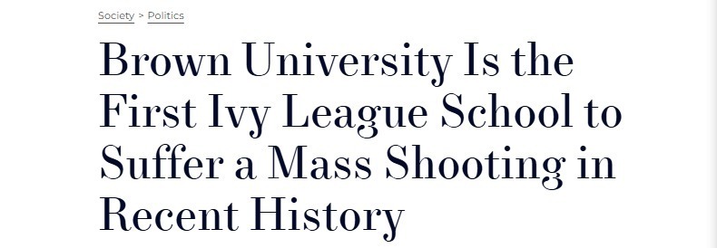 r2025年,美国校园的安宁屡遭打破。据美国《城镇与乡村》网站(Town and Country)报道,本月13日发生的布朗大学枪击案致2死9伤,成为常春藤盟校近期首所发生大规模枪击案的学校。事件导致校园提前关闭,师生陷入恐慌。校长克里斯蒂娜·H·帕克森(Christina H.Paxson)称,两名遇难者“都是才华横溢的年轻人,本应拥有光明的未来,却过早消逝”。