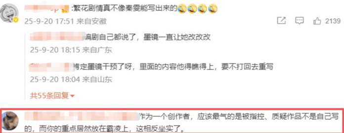 此外,网友觉得她作为一个编剧,最生气应该是“创作所属权”的问题,而秦雯偏偏要纠结“霸凌”等信息,这恰恰是反向证实了她的心虚。