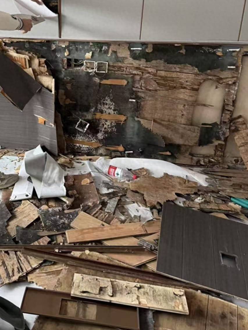沈杰回忆,随着施工方拆除工作的推进,主卧受影响的墙面范围不断扩大,还出现了漏水、发霉、生虫等问题,而该位置正是沈杰计划摆放床头的核心居住区域。“2025年了,还能造出这种房子当做新房来交付吗?房子里还能长虫,根本不敢想象。”沈杰坦言,墙体发霉和虫害问题让他不寒而栗,若稀里糊涂完成收房,日后日常起居都将受到影响,心理上也留下了极大阴影。